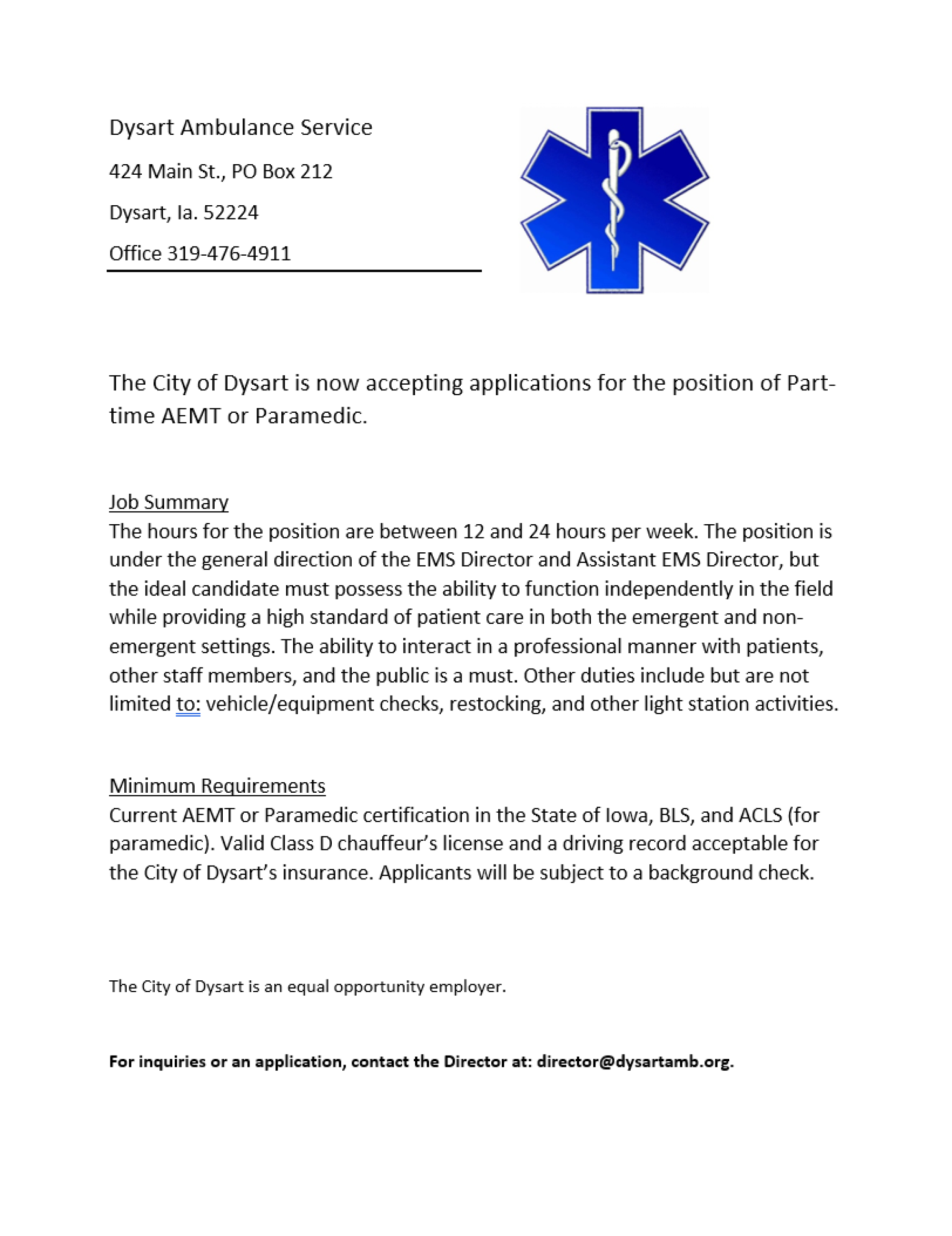 Current AEMT or Paramedic certification in the State of Iowa, BLS, and ACLS (for paramedic). Valid Class D chauffeur’s license and a driving record acceptable for the City of Dysart’s insurance. Applicants will be subject to a background check.